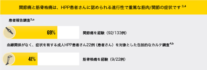 低ホスファターゼ症(HPP)患者さんには、骨格系障害とともに、ミオパチーや激しい筋肉痛、筋力低下などの筋肉の症状が認められます。このような症状により機能障害が起こり、結果として著しく衰弱することがあります1-7